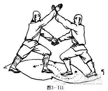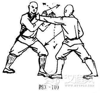 乙左掌迅速向外拨架甲右掌以护头,掌心斜向前,掌指向上。目视甲头部(图3一111).