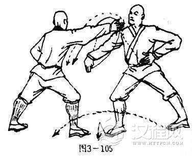 甲左脚为轴,右脚前上一步,体左转90度两腿成右弓步,同时,两拳变掌,右掌迅速推向乙右肩,掌心向下,掌指斜向前,左锗屈肘左掌护胸前,掌心斜向右,掌指向上.目视乙头部(图3一105).