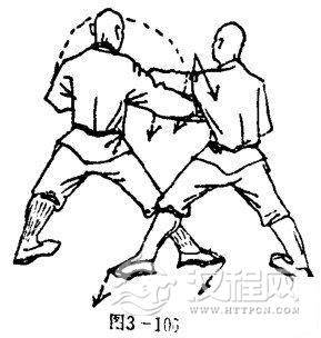 甲重心后移,两腿成叉步,右掌被拿,左嘴屈肘左掌护于胸前,掌心斜向右,掌指斜向上.目视左前侧(图3一106).