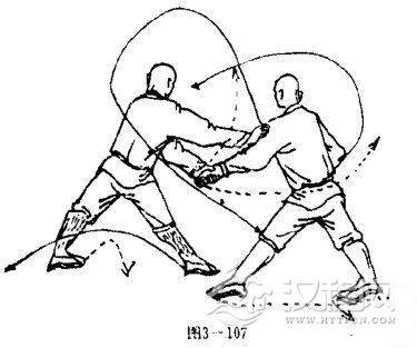 乙左腿抬起后移,摆脱甲右腿的勾绊,两腿成叉步:左掌被拿,右臂屈肘右掌护于胸前,掌心斜向前,掌指向上.目视右前侧(图3一107).