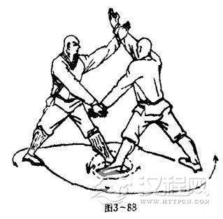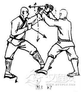 乙两腿不变,两掌再向上方推击甲左臂,掌心向外,掌指向上.目视双掌(图3-87).