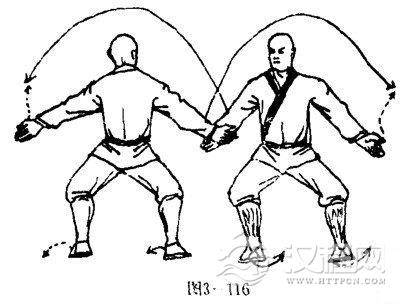 甲乙双方两脚蹍地.体左转90度,使两腿成马步;乙两拳变掌,双方两掌向两侧穿击,两掌心向前,两掌指斜向外.目视右前侧(图3-116).