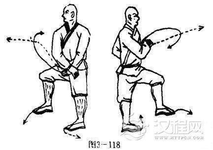 甲乙双方两脚为轴,休右转180度,左脚前上半步震脚下落,左腿直立支撑右腿屈膝提起,两腿成独立步,同时两掌紧握拧抱于腰间下侧,两掌心向内,掌指斜向下。目视前方(图3-118).