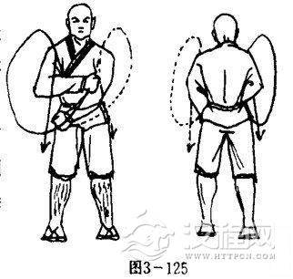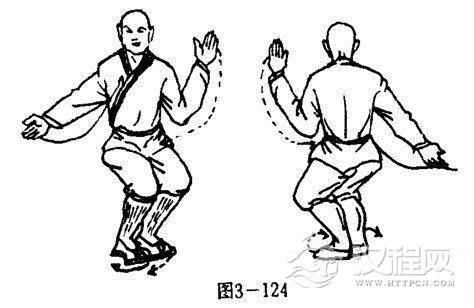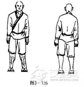 甲乙双方两脚眼地,体右转90度,使两腿成小八字步站立.同时,两掌变拳,右臂屈肘右拳收护于左肋前侧.左嘴屈肘左拳护于腰间右下侧,两拳心斜向内,拳眼斜向上.目视前方(图3-125).