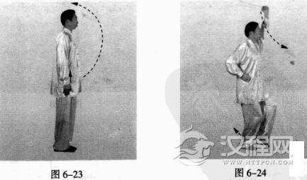 上动不停。左脚向后扒地蜷腿,左拳稍向右、向前下落。(图6-25)