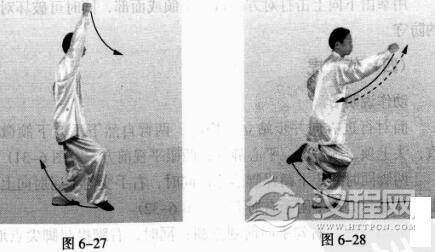 上动停。右脚上步,脚尖点地;同时,右拳向上举。(图6-27)