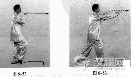 上动稍停。右脚回收脚尖点地;同时,右掌屈肘回收.掌指保持向前。(图6-52)