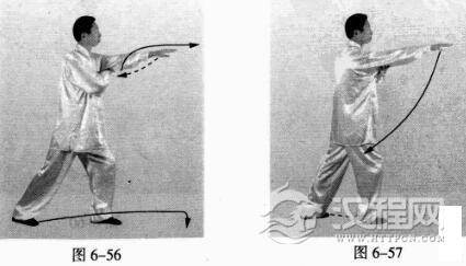 接上动。右脚上步跺脚落地.左腿服伸成弓步;同时,左掌下按并回收至右腋下,右掌自左掌上向前戳击,掌指向前。(图6-57)