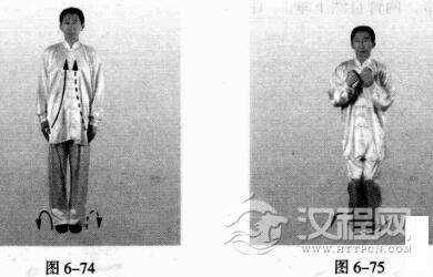 并步站立,松肩,两臂自然下垂.下颌微内收,头上顶,胸微含,平心静气;两眼平视前方。(图6-74)