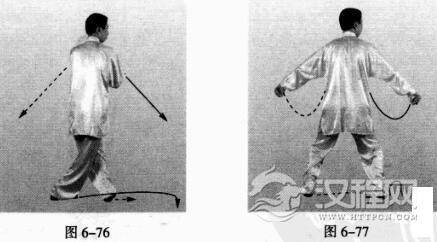 上动微停。右脚以脚掌为轴,左脚以脚跟为轴,身体左转。(图6-76)