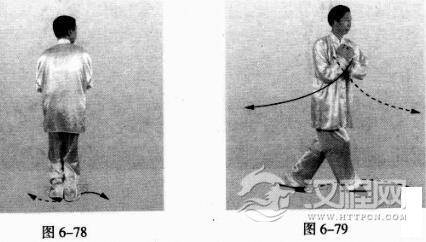 上动微停。左脚以脚掌为轴,右脚以脚跟为轴,身体右转。(图6-79)