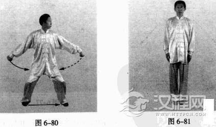 如此反复练习,至最后一个动作,后脚上步成并步站立,两拳变掌,两臂自然下垂。(图6-81)