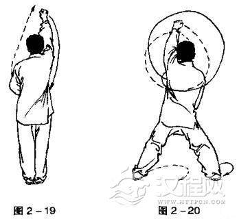 ①两脚合拢成并步,身体立直;右手变拳,收回左腰际.沿胸前中线向上击出,拳过头顶,拳眼向右;左手变拳,拉画下压置于小腹前,拳眼向上。目视右手(图2一19)