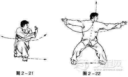 ②双脚分开,身体下蹲成马步;左拳沿腌前中线向上击出。拳过头顶,拳眼向左;右掌拉回下压置于小腹前.拳眼向上。目视左拳(图2一20)