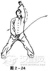 ②两脚分开,身体下蹲成马步;左拳沿胸前中线向上击出,拳过头顶,拳眼向左;右拳拉回下压置于小腹前,拳眼向上。目视左拳(图2-24).