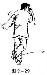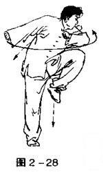 身体后移.右转体,独立右足,略屈膝,提左膝;双手变龙爪掌,扒下后摆,直右臂、屈左臂,左手置于右胸侧。目视左侧(图2一28)。