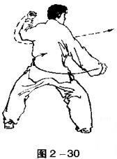 右转体,震左脚成马步;前劈左臂,屈肘里扣前臂,握拳置于左肩侧.拳眼向外;前劈右臂,前臂下压握拳置于身体右侧.拳眼向外。目视右侧(图2一29、图2-30)。