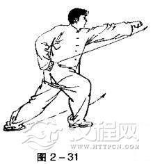 右转体成右弓步;左拳由腰际平击出。拳眼向右;右拳拉回置于右侧腰际,拳眼向上,目视左拳(图2一31)。