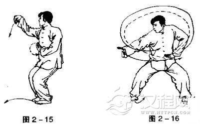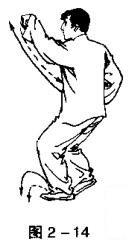 右转体;左手变勾,后抡前提;起动左脚,上右脚成丁步,双足震脚成并步;右手变勾,后抡前提;左手变掌,拉回下压置于腹前,掌心向下。目视右手(图2一14,图2一15)