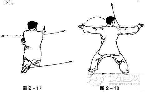 ①左转体.下蹲成歇步;左臂竖抡一周,掌立于右肩侧;右臂跟上,抡劈一周,手掌置于左腋下侧;目视右侧(图2一17)