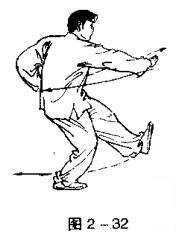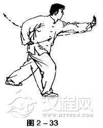 撤左腿成右弓步;左掌平推出.掌心向前;右掌拉回置于右侧腰际,掌心向下,目视左手(图2一33)