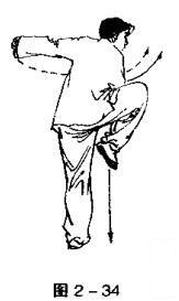 身体后移,左转体.独立右足,略屈膝,提右膝;双手变龙爪掌,扒下后摆,直左臂,屈右臂,右手置于右胸侧。目视右侧(图2一34)。