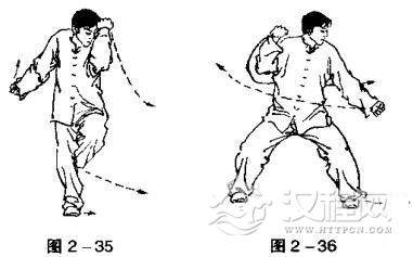 右转体,震右脚成马步;前劈右臂,屈肘里扣前臂,握拳置于右肩侧,拳眼向右;前劈左臂,前臂下压、握拳置于身体左侧,拳眼向左。目视左侧(图2一35,图2一36).
