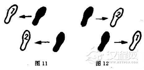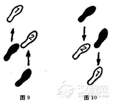 要领:开始前进时,左脚略提踵,右脚同时向后蹬地,两脚保持原距离同时前移。这时上体保持原来姿势,身体重心的投影始终落在两脚之间。