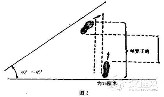 两脚前后的距离(前脚尖至后脚跟)略宽于肩。两脚左右的距离,即从前脚尖内侧和后脚跟内侧各画一条直线,并使两线平行,两线之间的距离约为10-15厘米。
