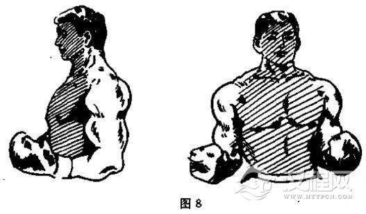 拳击得分的部位,是攥紧拳头的拳面(图7),清晰地击打对方头的正面、侧面及腰带以上的上体的正面及前侧部分,即图8中的阴影部分。