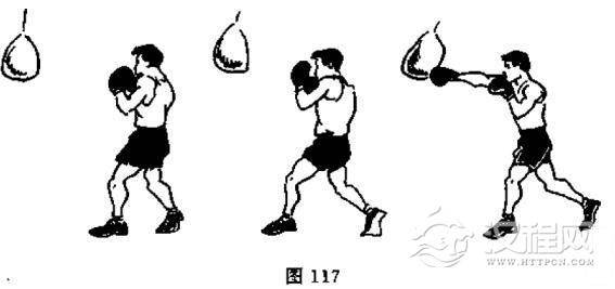 左右直拳连击的打法:先对准球面的1/3处,上半步同时打出前手直拳,当球刚启动前摆时,紧跟着打出后手直拳,或当球回摆到垂直线时再打出后手直拳。