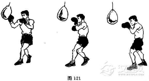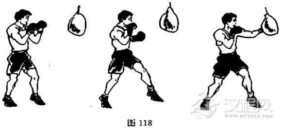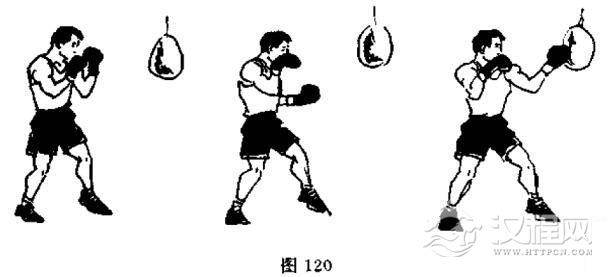 前手拳对准球的正面下端1/3处,当球摆荡进入拳程时.打出前手直拳或上半步击打球。