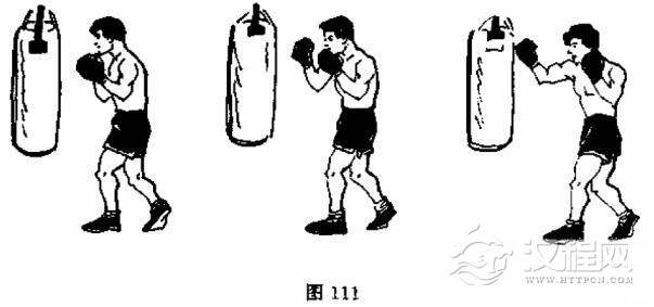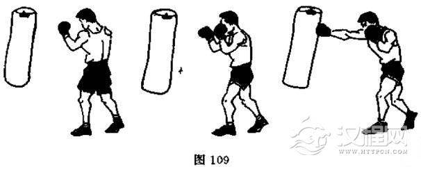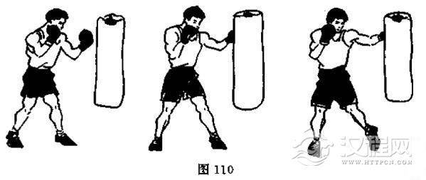 从拳击实战姿势开始,在左拳出击的同时重心前移,左肩随着前探,用前脚段地,腰部向右转带动左臂前击,以增加击打力量.在击出的同时,左臂转动,在左拳与沙袋接触瞬间拳心向下.