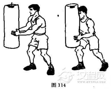 稳定式打法:二人一组.一人扶稳沙袋,另一人练习击打,这样可以避免沙袋转动和距离上不准确。扶沙袋的人还可以帮助纠正出拳姿势和出拳路线上的错误。扶沙袋的人要能看清击打人的动作。击打人力量小,可用图114中左图那样扶法;击打人力量较大,可像图114中右图那样扶法。