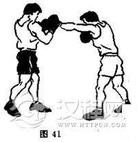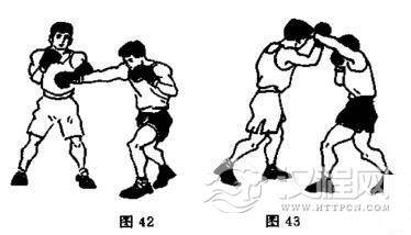 (2)右(左)前臂向下格挡左(右)直拳击腹(图42)
