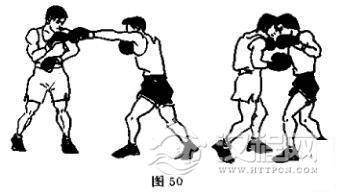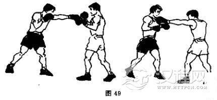 左肩阻挡右直拳击还击头部或右上钩拳击腹(图50)