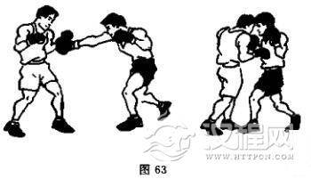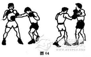 向后闪以左直拳击还击头部,或用右上钩拳还击腹部(图64)