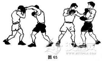 右前臂阻挡并以左上钩拳击还击对手下颏(图65)