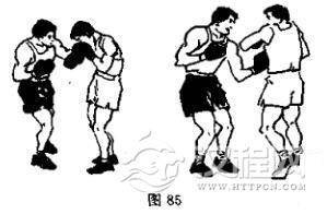 (5)左平钩拳击头接左上钩拳击腹(图85)