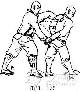 乙两脚开立;右手被反臂抓拉于体右后侧,左掌护腰前侧,掌心向内,掌指向前.目视右侧方(图11一126)。