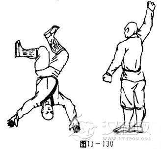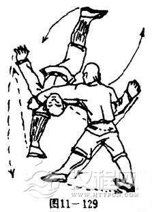 甲右腿向上翘起,体向后倒栽.同时,右臂被乙夹住:左掌展于左侧方,掌心向外,掌指向上.目视前左侧(图11一129)。