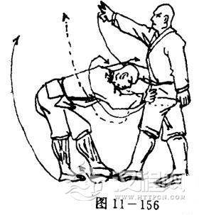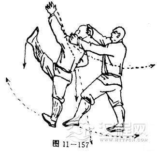甲左虚步站立,上体前伏以头部顶击乙方腹部;同时,双手抓住乙两大腿.目视下方(图11一156).