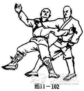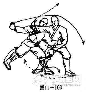 乙右横弓步变成左横弓步:同时右掌横挡于甲右肩前方;左手抓甲左腿膝窝处.目视甲方(图11一103).