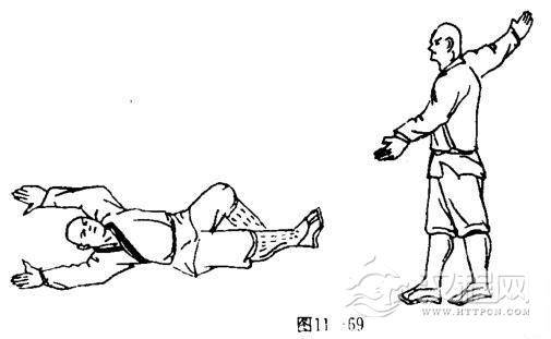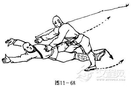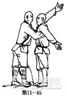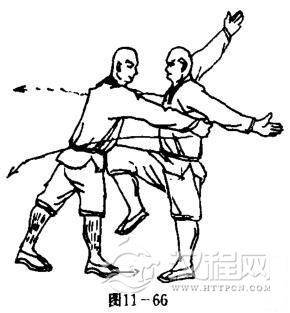 甲两脚后撤,两腿成高叉步,上体前探,两臂伸直,两手抓住乙上体不放.目视乙方(图11一66).