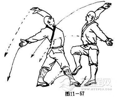 乙两腿成独立势,两臂向两侧展开,两掌心斜向上,掌指向外.目视前方(图11一67).