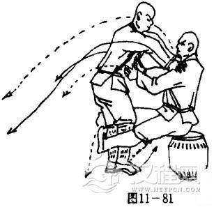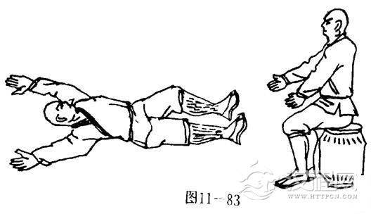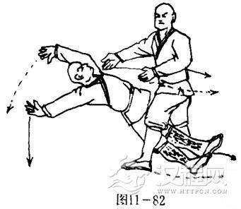 甲两腿被勾,上体被乙双掌猛力推击,体向后倒,两臂向后伸展,掌心向外.目视上方(图11一82).