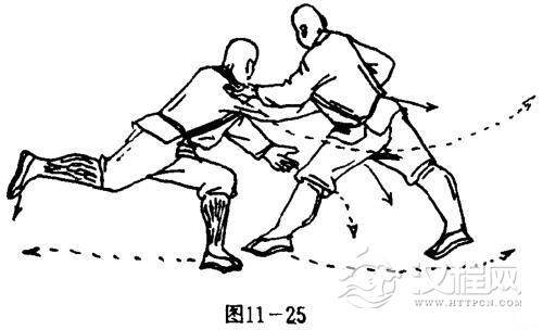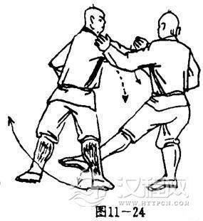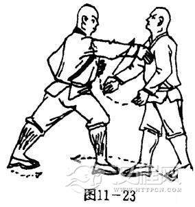 甲左脚跟内旋,两腿变成高叉步;右臂被抓,左臂屈肘左掌护胸。目视乙方(图11一24)。