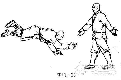 甲被抓拉、按压后,右脚向后离地抬起,上体前伏,同时,左掌欲仆地,掌心斜向下,掌指向前:右手被摘。目视前下方(图11一25)。