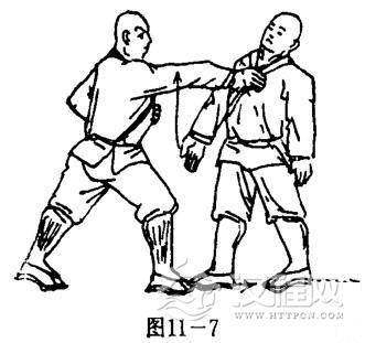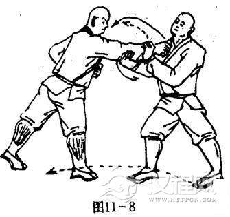 上体前探,甲右手被抓:左臂屈肘左手护胸前.掌心向内,掌指向前.目视乙方(图11一8).