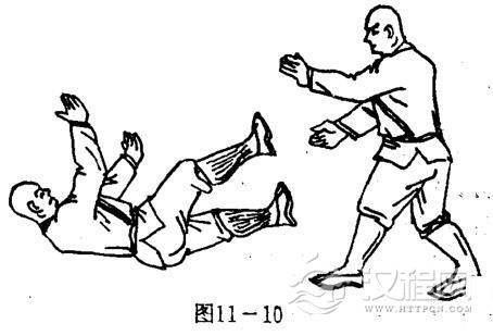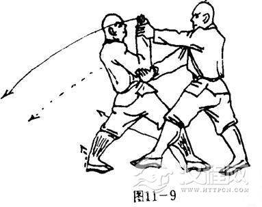甲两腿变成高又步;同时,右手肘被拿;左掌护胸不动,上体后仰.目视乙头面(图11一9).